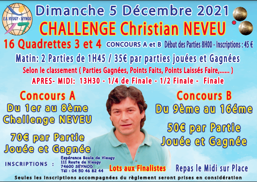 Le dimanche 5 décembre 2021 (8H00) au boulodrome de Vieugy aura lieu le challenge Christian NEVEU.