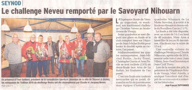 C'est l'équipe de la Motte-Servolex composée de Claude NIHOUARN, Juan VILLALTA, Jean-paul SOUVETON et Jean-Cyril THERY qui l'emporte devant une autre équipe savoyarde emmené par Guy ARVAT, Claude STACHETTI, Antoine QUAGLIARELLO, Thierry OUDRY et Fabrice BARAILLE sur le score de 13 à 4.