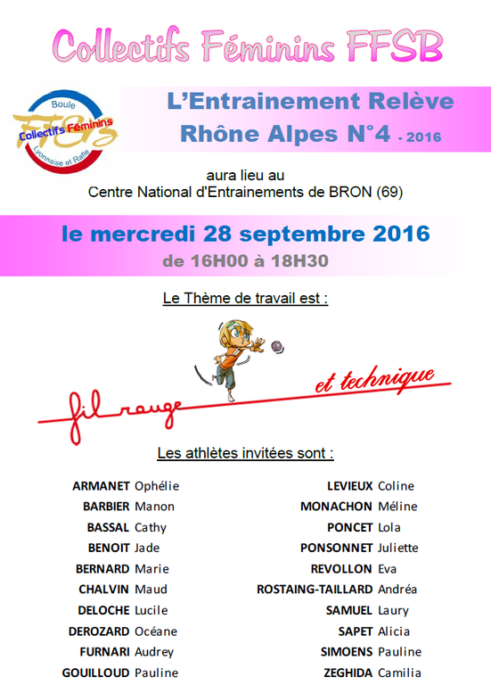Deux jeunes filles de l'Espérance Boule, Méline MONACHON et Lucie DELOCHE participeront à '" l'entrainement relève Rhône Alpes" qui aura lieu le Mercredi 28 Septembre au centre national de BRON(69).