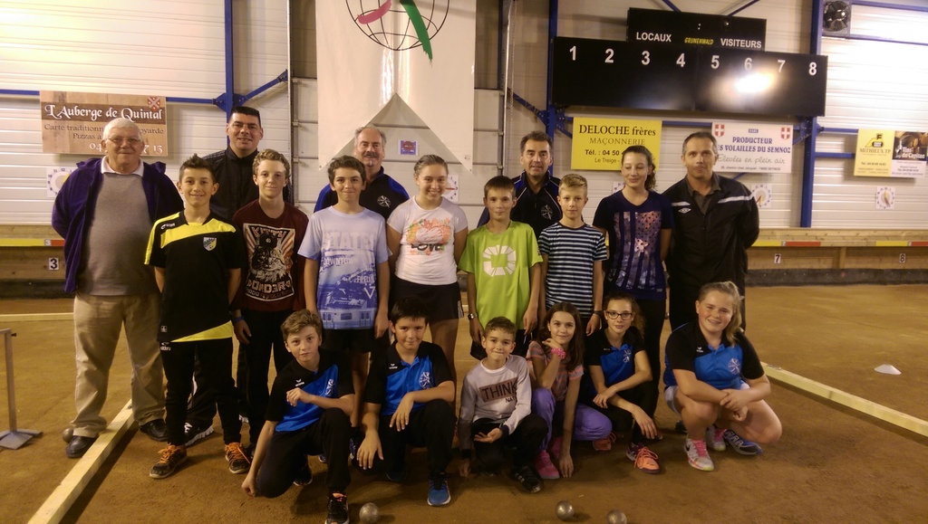 Les jeunes de l'école de boule un soir d'entrainement,accompagnés de leurs éducateurs Pascal MASSON, Laurent DELOCHE, Gérard MEUNIER, du nouveau conseiller technique fédéral Ronan RECIO et du président Marc AURELLE.