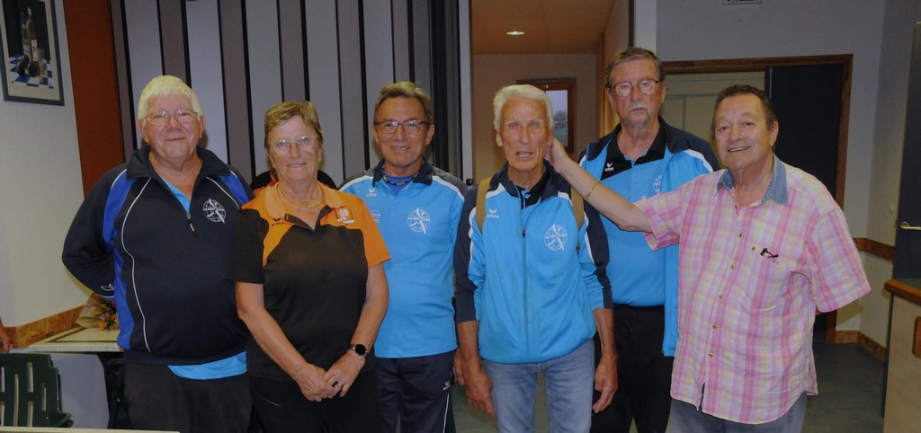 les joueurs de gauche à droite sur la photo (Marc Aurelle, Gérard Delozanne, Pierre Deloche, André Pallud, Raymond Fernandez) accompagné de la Présidente de L'ASBR Josée Barrère-Morel.