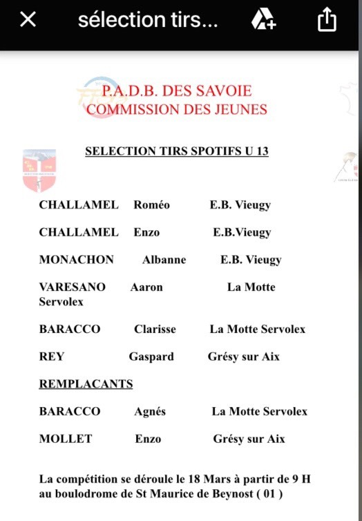Trois de nos joueurs U13 feront partie de la selection U13 des 2 savoies pour une compétition de tir sportif qui aura lieu à Saint Maurice de Beynost le 18 Mars prochain.