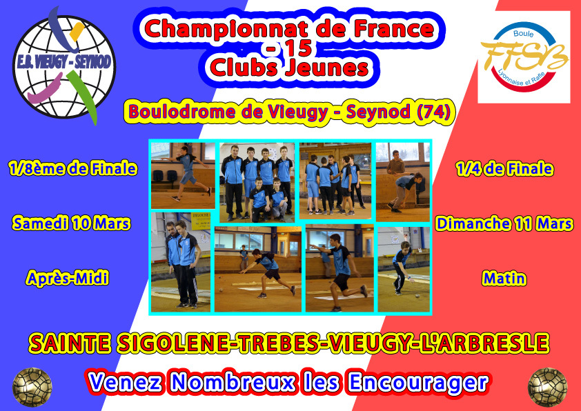 Le samedi 10 Mars à 14H et le Dimanche 11 Mars à 8H, au boulodrome de VIEUGY auront lieu respectivement les 1/8ème et les 1/4 de finale du championnat de France des clubs sportifs dans la catégorie U15.